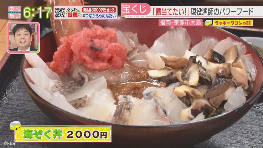 ラッキーワゴンの旅宝くじSP 宗像市・後編 2022年9月15日(木) 【問】漁師料理 海宝丸 【住所】福岡県宗像市大島1636-1 【電話】090-4776-2217 ・刺身定食 2000円 ・海ぞく丼 2000円 ※魚は日によって、変わります ※ 掲載している情報は全て放送当時のものです。ご了承ください。 オンエア情報一覧へ戻る SEARCH過去の情報を探す オンエア日で検索 OA Calendarオンエア情報一覧 キーワードで検索 キーワード例:カレー 中央区 コーナーから検索 コーナー紹介へ 番組トップへ戻る 関連情報 番組公式SNS RECOMMENDおすすめ番組 記事一覧