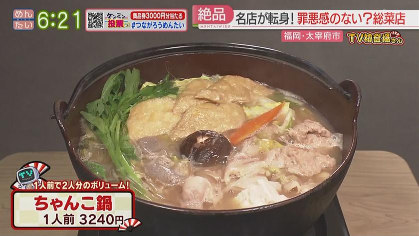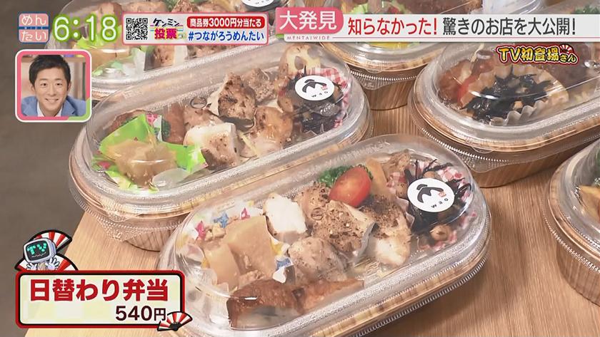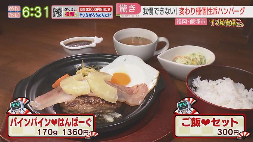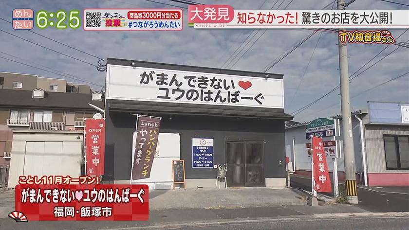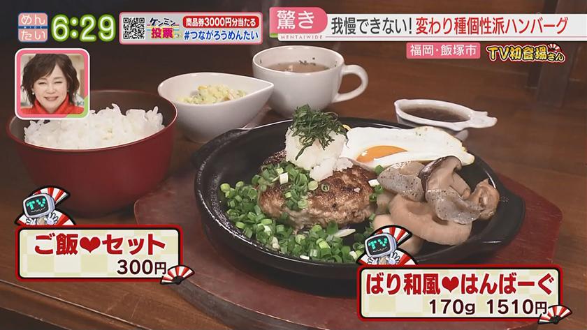 TV初登場さん華麗なる転身をした店 2022年11月23日(水) 【問】おいしそうざいwao 【住所】福岡県太宰府市通古賀5-14-22 【電話】092-924-1972 ・日替わり弁当 540円 ・ちゃんこ鍋 1人前 3240円 【問】がまんできない♡ユウのはんばーぐ 【住所】福岡県飯塚市若菜259-3 【電話】0948-25-2929 ・ばり和風♡はんばーぐ 170g 1510円 ・ご飯♡セット 300円 ・パインパイン♡はんばーぐ 170g 1360円 ※ 掲載している情報は全て放送当時のものです。ご了承ください。 オンエア情報一覧へ戻る SEARCH過去の情報を探す オンエア日で検索 OA Calendarオンエア情報一覧 キーワードで検索 キーワード例:カレー 中央区 コーナーから検索 コーナー紹介へ 番組トップへ戻る 関連情報 番組公式SNS RECOMMENDおすすめ番組 記事一覧