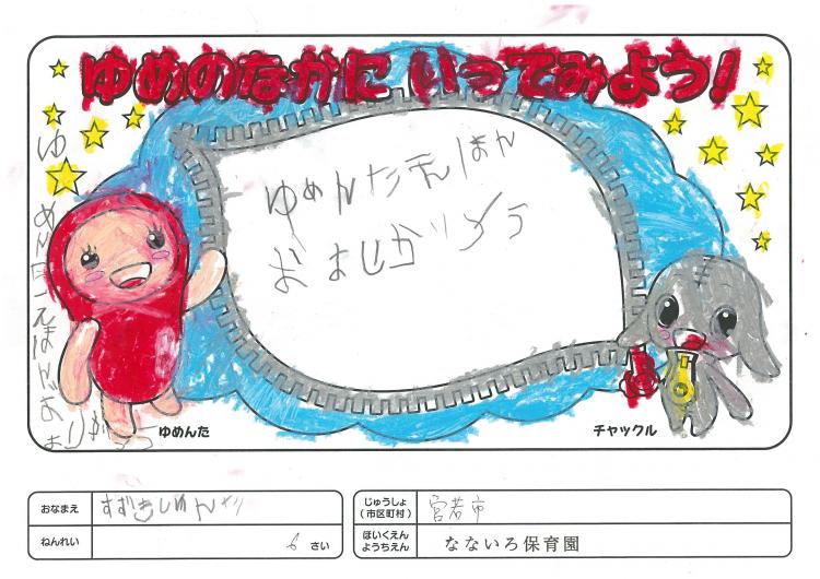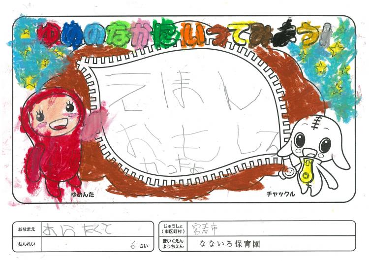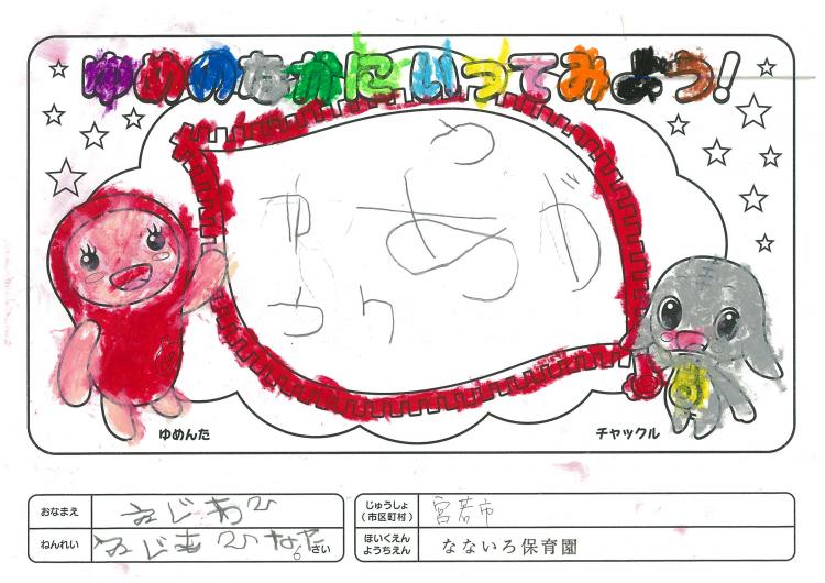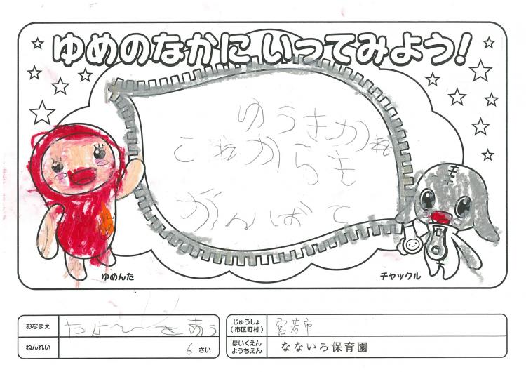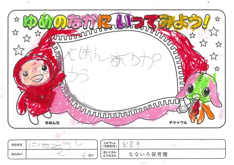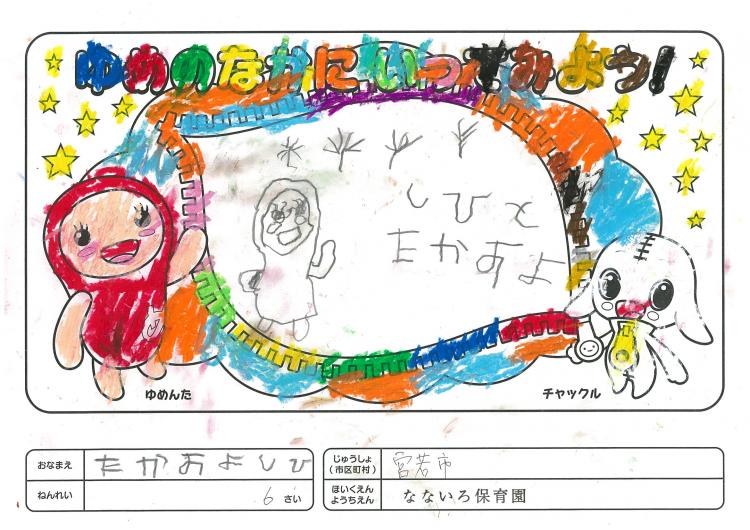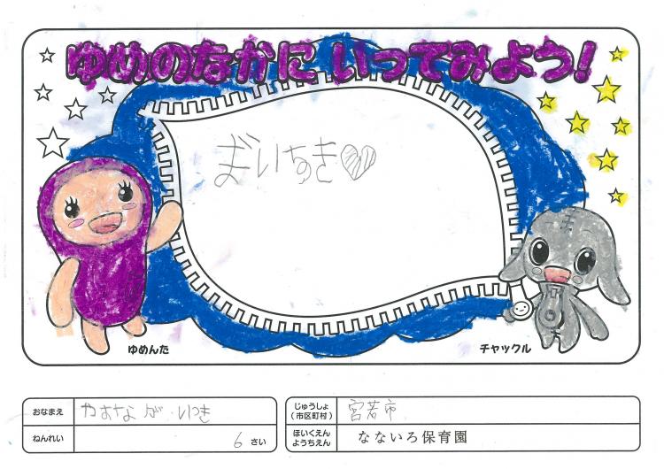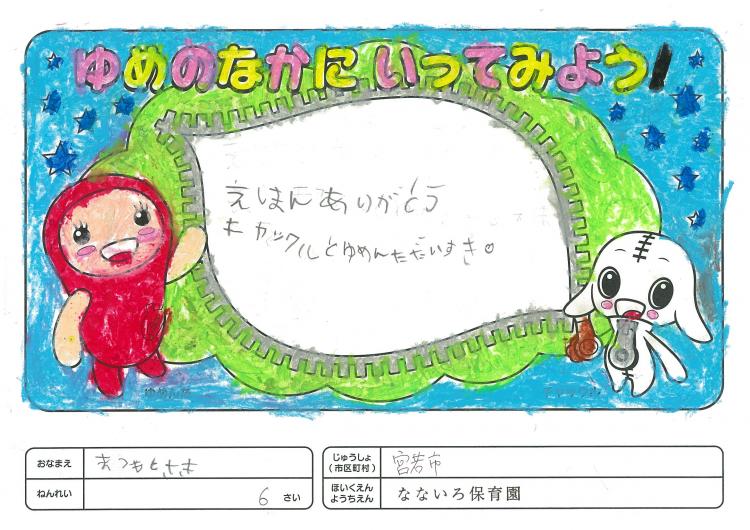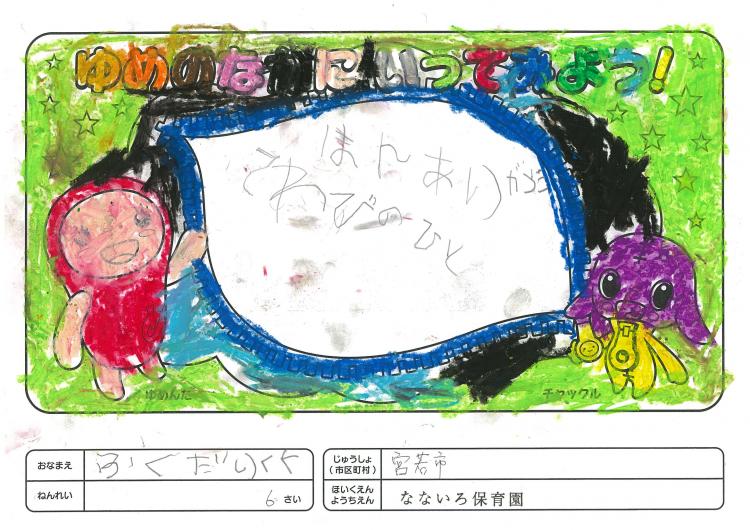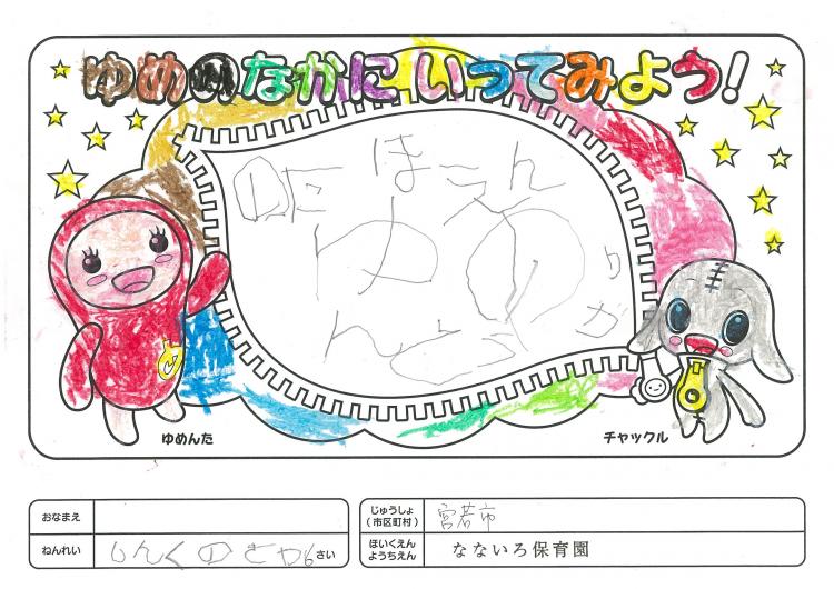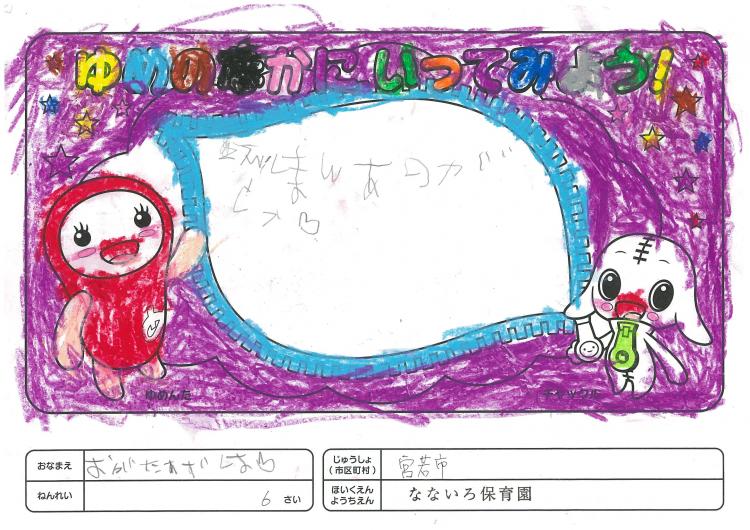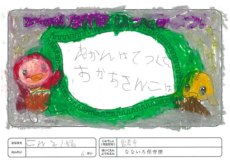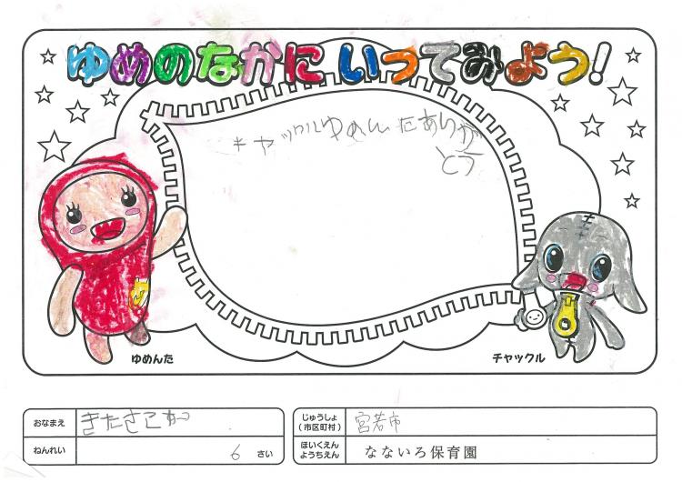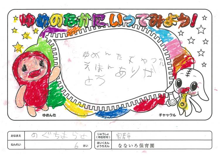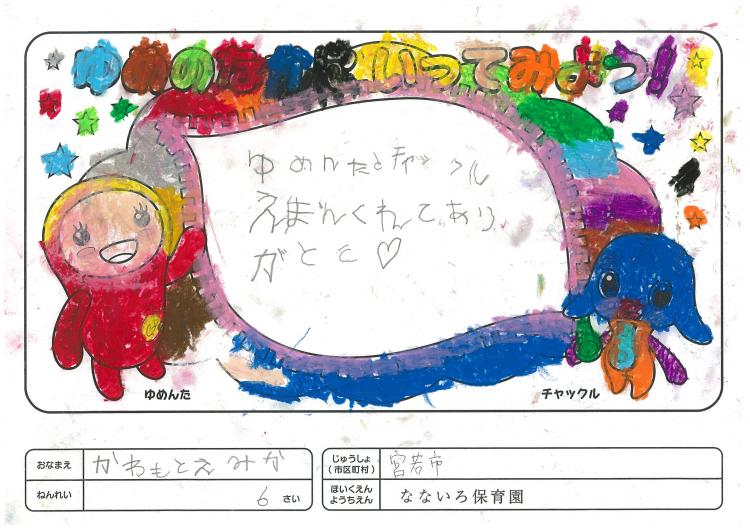 2020/06/26なないろ保育園(宮若市) かんそう先日はオリジナル絵本を保育園にいただきありがとうございました。 0歳児から5歳児まで各クラスで読ませていただきました。 年長クラスがお礼を込めてぬりえをしましたので送付します。 ぬりえをした子ども達は、今新一年生で小学校に行っています。 コロナの影響で今までのようにはいきませんが、これからの世の中が 少しでも子ども達の未来に希望が持てるよう保育園でも取り組んでいかなくては いけないと思っています。これからも子ども達が笑顔でいられるような番組を よろしくお願いいたします。